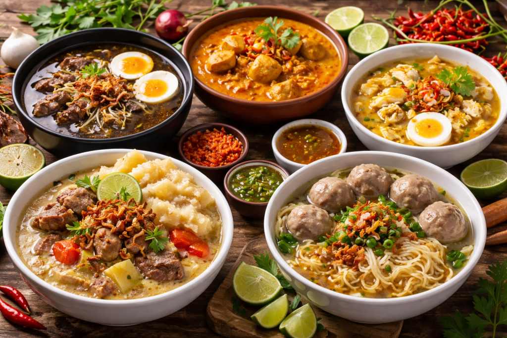Ilustrasi : Ragam hidangan berkuah khas Indonesia seperti Soto Betawi, Rawon, Gulai, dan Bakso yang masuk dalam daftar sup terbaik dunia versi TasteAtlas 2026
